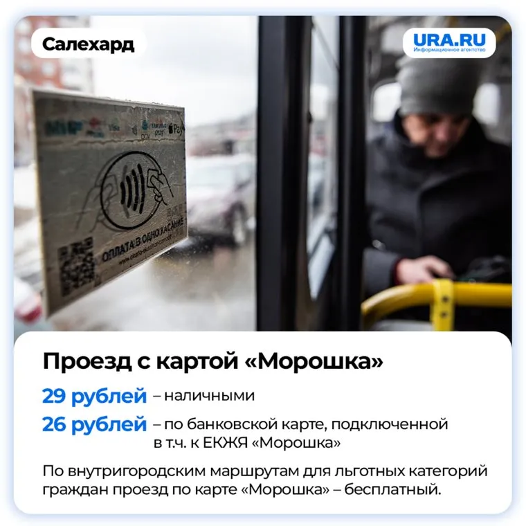 По внутригородским маршрутам для льготных категорий граждан в Салехарде проезд по карте «Морошка» — бесплатный. Для иных категорий пассажиров стоимость — 26 рублей.