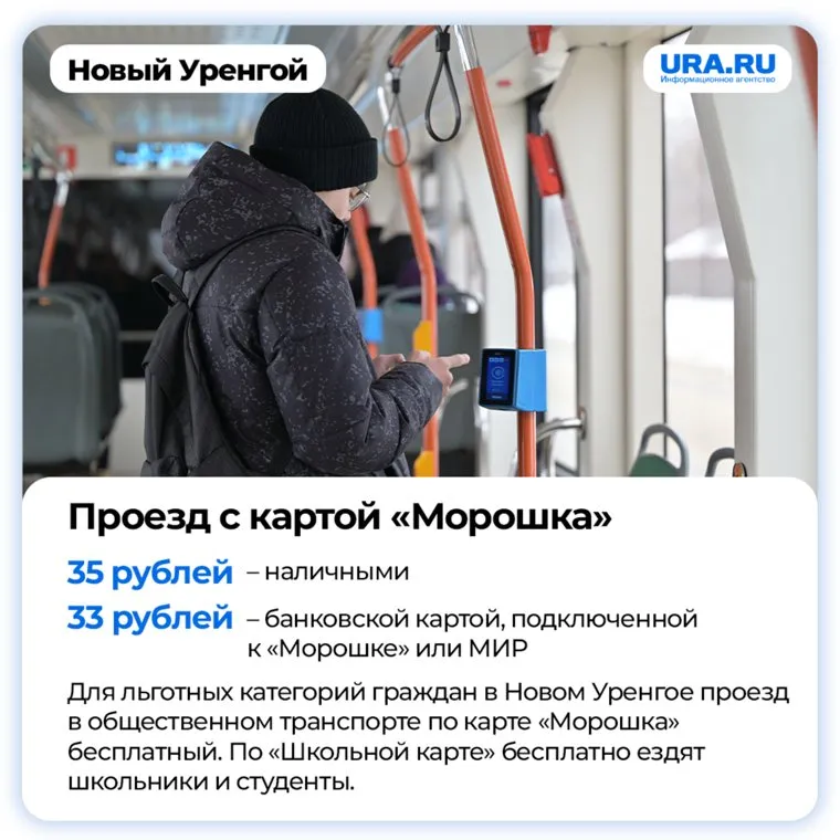 «Для льготных категорий граждан в Новом Уренгое проезд в общественном транспорте по карте „Морошка“ бесплатный. По школьной карте в городе бесплатно ездят также все школьники и студенты», — сообщили URA.RU в мэрии Нового Уренгоя.