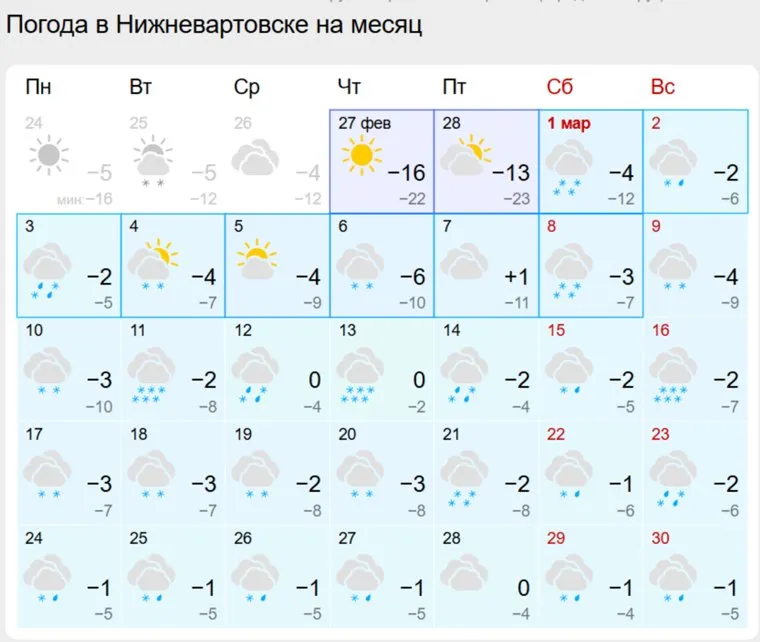 Больше всех погода порадует жителей Нижневартовска. В канун 8 Марта в городе ожидается самый теплый день — столбики термометров поднимутся до +1. А в Сургуте и Ханты-Мансийске в преддверии праздника днем будет холоднее примерно на шесть градусов.