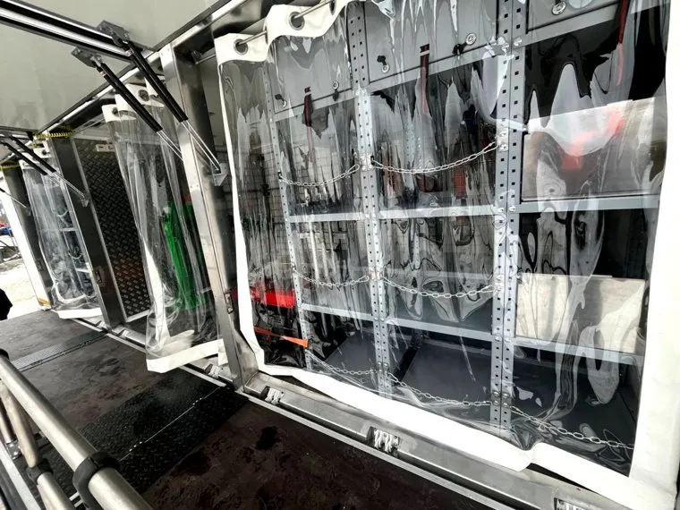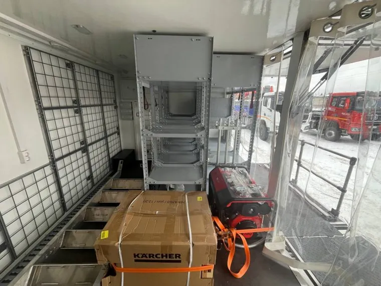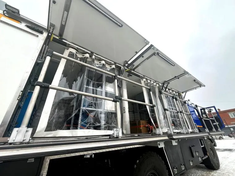 Фургон разделен на два основных отсека. В одном будут храниться запчасти, в другом — проводиться ремонты. Стенка с правой стороны по ходу движения открывается, трансформируясь в пол и потолок. Это дополнительно расширит пространство для работ. Чтоб можно было перевозить запасные колеса, крышу и заднюю стенку инженеры усилили.