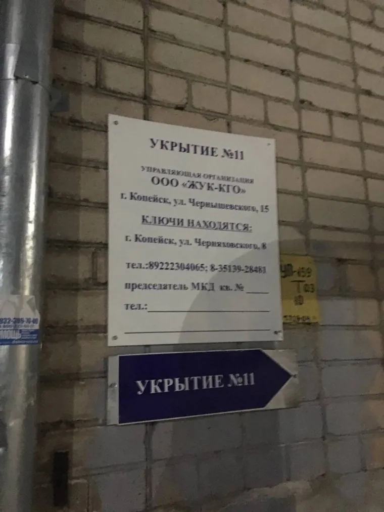 Жители Копейска (Челябинская область) стали замечать на домах таблички, указывающие на наличие укрытий, в которых при возникновении опасности могут спрятаться люди. Об этом копейчане сообщают в социальных сетях.