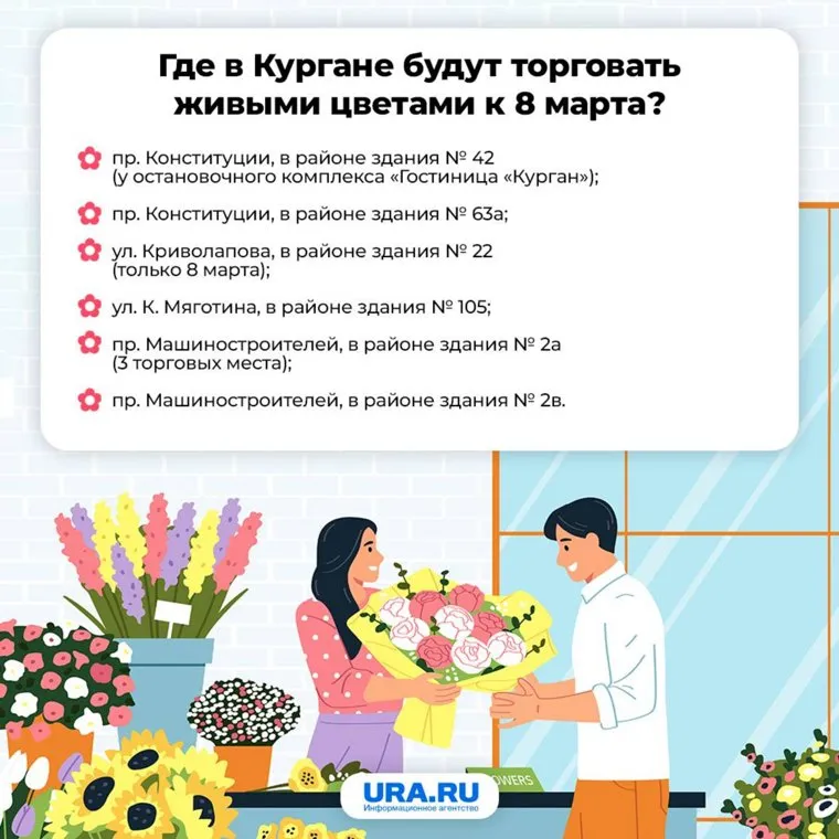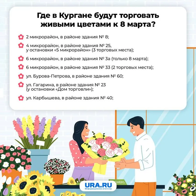 «Департаментом экономического развития, предпринимательства и торговли администрации города Кургана в целях организации предпраздничной торговли цветами к 8 марта заключено 18 договоров на размещение нестационарных объектов уличной торговли. Автомагазины и палатки для торговли живыми цветами будут работать с 3 по 8 марта», — указано в посте.