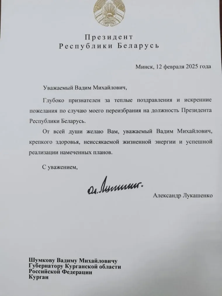 Президент Беларуси Александр Лукашенко вручил благодарность губернатору Курганской области Вадиму Шумкову в качестве поздравления с переизбранием. В своем письме Лукашенко подчеркнул важность поддержки и выразил пожелания губернатору. Об этом сообщается в telegram-канале курганского правительства.