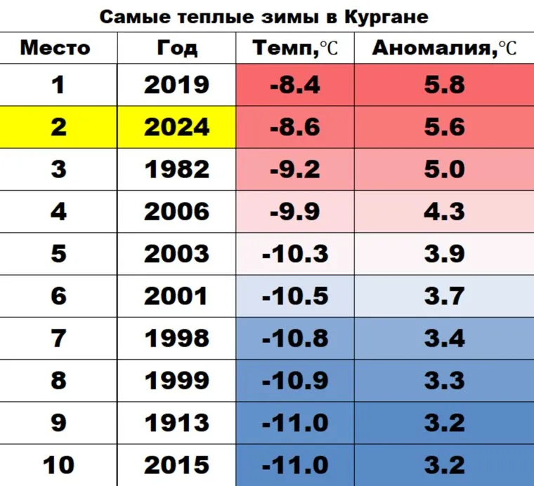 «Средняя температура прошедший зимы в Кургане была -8,6 градуса. Это на 5,6 градуса выше нормы. Прошедшая зима заняла второе место в рейтинге самых теплых зим. Первое место принадлежит зиме 2019-2020 гг.», — говорится в telegram-канале «Погода 45».