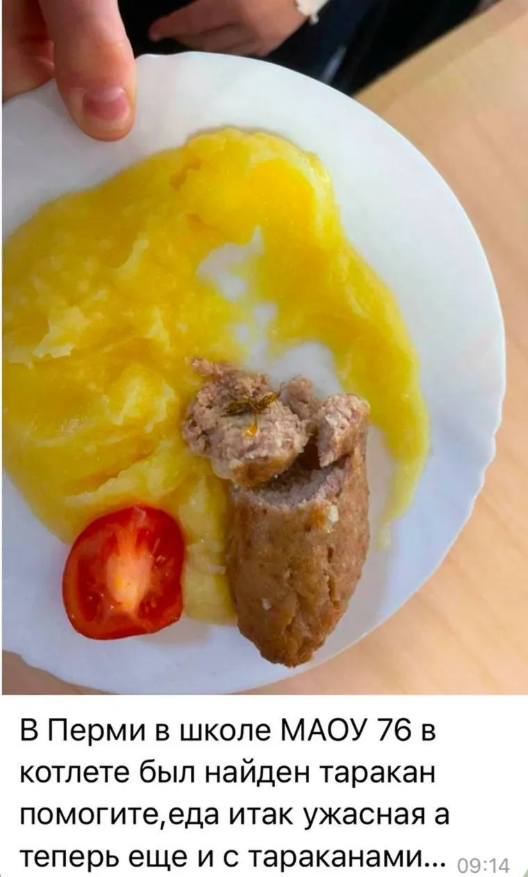 «В Перми в школе МАОУ 76 в котлете был найден таракан, помогите. Еда и так ужасная», — претензию Екатерина Мизулина выложила в своем telegram-канале.