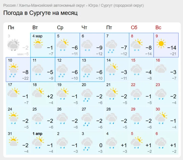 «Погода в марте будет преимущественно то пасмурная, то облачная с прояснениями», — следует из данных портала. Единственный ясный солнечный день в Сургуте и Ханты-Мансийске ожидается 9 марта. А вот в Нижневартовске солнце начнет выглядывать из-за облаков только к концу месяца.