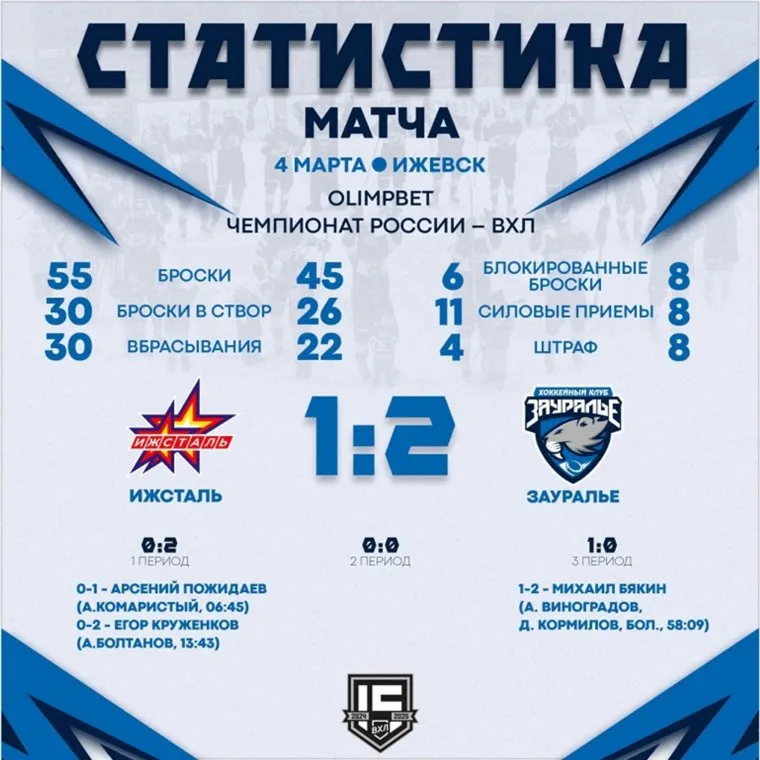 «В Ижевске ХК „Зауралье“ обыграл команду „Ижсталь“ со счетом 2:1. Непросто сложилась для нас игра, но смогли забрать важнейшие два очка», — сообщается в telegram-канале клуба из Кургана.