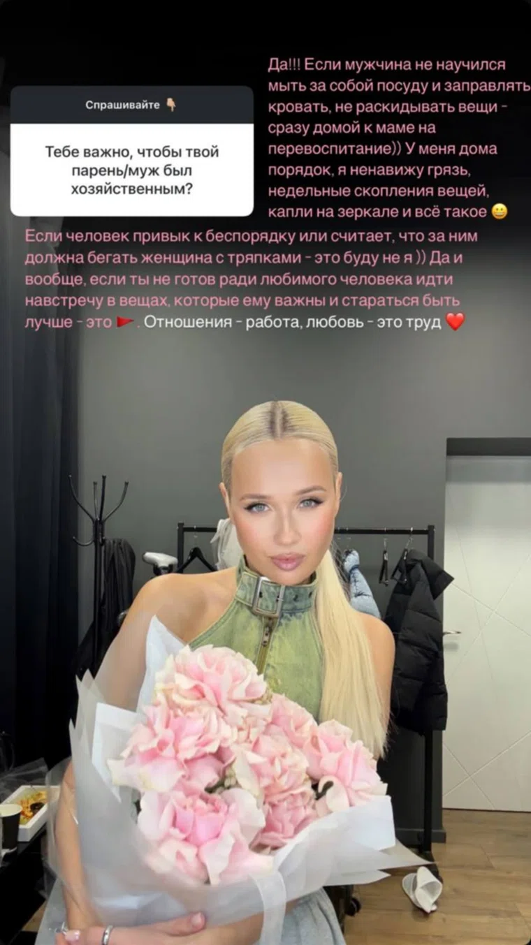 «Если мужчина не научился мыть за собой посуду и заправлять кровать, не раскидывать вещи — сразу домой к маме на перевоспитание. У меня дома порядок, я ненавижу грязь, недельные скопления вещей, капли на зеркале и все такое. Если человек привык к беспорядку или считает, что за ним должна бегать женщина с тряпками, — это буду не я», — написала Кока в Instagram (запрещен в РФ, принадлежит компании Meta, которая признана экстремистской и запрещена в России).