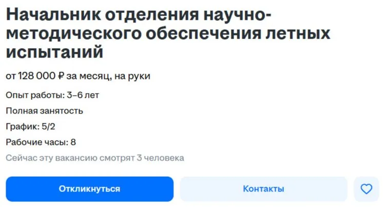 Начальник отделения научно-методического обеспечения летных испытаний может получать от 128 тысяч рублей. На должности необходимо будет руководить отделением при проведении летных испытаний, контролировать различные процессы и разрабатывать программы для подготовки персонала.