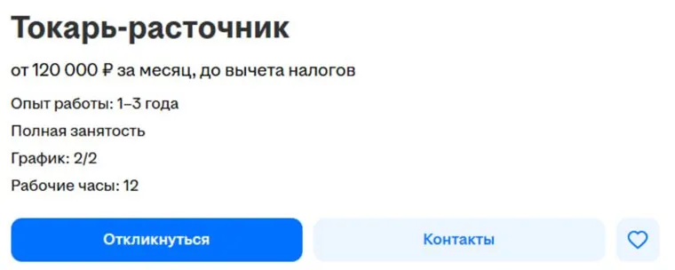 Токарям-расточникам на предприятии готовы платить от 120 тысяч рублей. Однако отмечается, что сумма в вакансии указана до вычета налогов. В обязанности специалиста входит: выполнение на токарном станке расточных операций.
