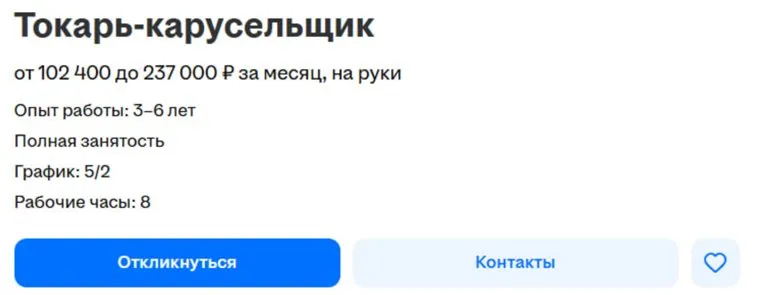 Токарю-карусельщику там предлагают зарплату до 237 тысяч. Чтобы успешно трудоустроиться, необходимо иметь свидетельство по профессии и опыт работы от трех лет.