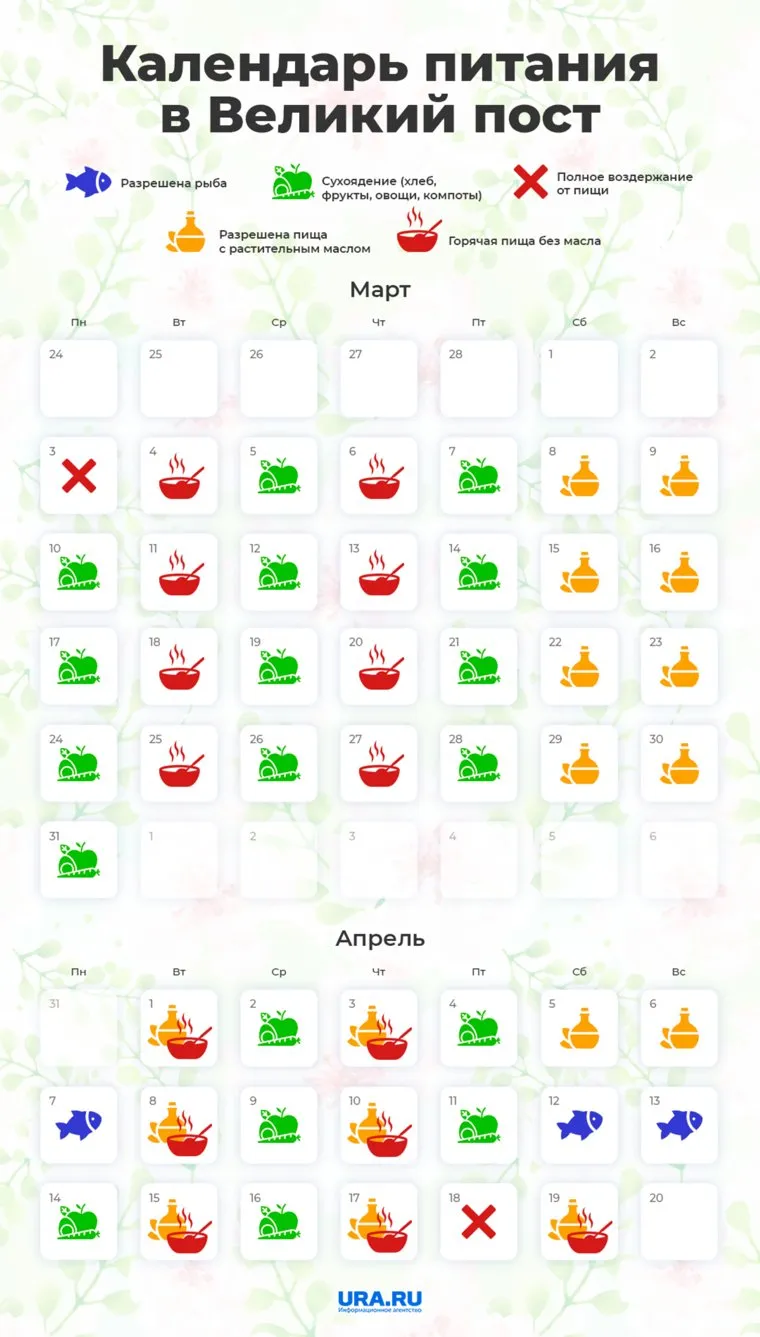 В период Великого поста разрешается употреблять в пищу овощи, зелень, ягоды, сухофрукты, фрукты, орехи, бобовые, крупы, грибы, мед. Также можно пить кисели и компоты. Разрешено есть хлебобулочные изделия, которые приготовлены без добавления яиц и молочных продуктов. Включение в рацион рыбы и других морепродуктов возможно лишь в специально установленные дни. Так, 7 апреля, в день Благовещения, и 13 апреля, в Вербное воскресенье, дозволено употребление рыбы. В Лазареву субботу, которая в этом году приходится на 12 апреля, можно употреблять рыбную икру..