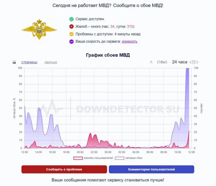 Downdetector зафиксировал массовые жалобы на работу сайтов МВД