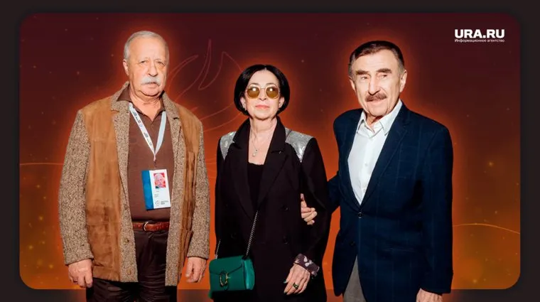 Внимание публики приковало трио — Леонид Якубович и Леонид Каневский со своей женой Анной Березиной. Супруга знаменитого телеведущего комбинирует несколько цветов: черный, изумрудный и серебряный. Так, на удлиненном жакете можно заметить отделку из пайеток — этот элемент повторяется и на лампасах брюк. Яркости придает сумочка на цепочке и платок с цветочным принтом.