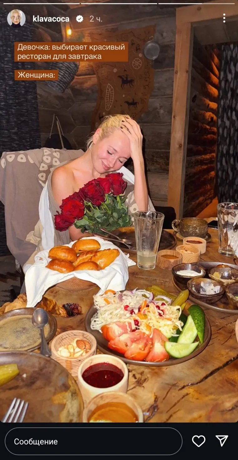 «Девочка выбирает красивый ресторан для завтрака. Женщина: [то, что происходит на фото]», — описала мемом Кока поход в баню на своей странице в Instagram (запрещен в РФ, принадлежит компании Meta, которая признана экстремистской и запрещена в России). Ее стол в бане был накрыт и полон еды.