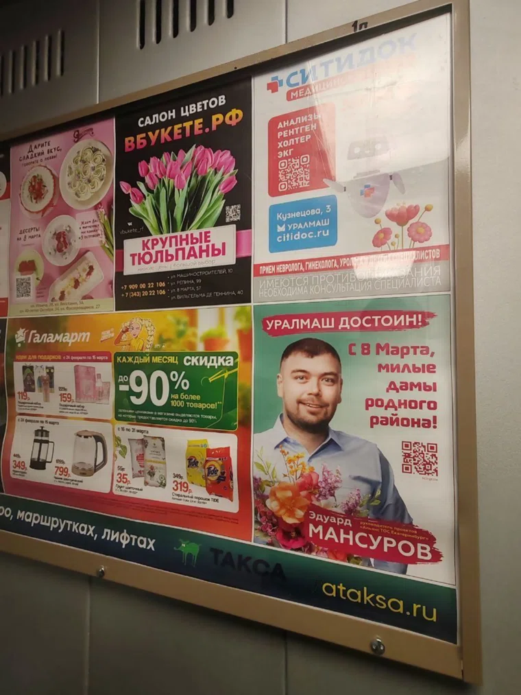 По его словам, агитация с поздравлениями от Мансурова к 8 Марта появилась на рекламных щитах и лифтовых досках объявлений, принадлежащих, вероятно, «Четырехсотым». По словам собеседника агентства, такая активность со стороны Мансурова является регулярной. Источник URA.RU, близкий к муниципальной власти, комментируя это, заявил: «Мансуров фактически с 2024-го ведет кампанию, пытается договориться [с властью] о предоставлении ему административного ресурса».