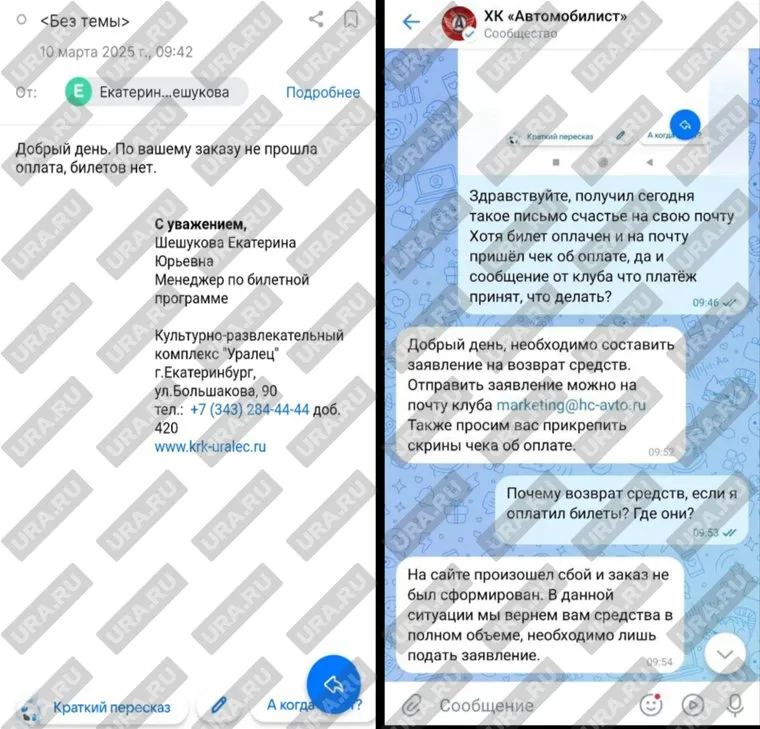 «Билет был куплен, чек об оплате есть, на почту пришло сообщение от клуба об оплате, сейчас такое сообщение получил», — пишет Руслан. В письме от КРК «Уралец» сказано, что у молодого человека не прошла оплата, а билетов нет. С аналогичной проблемой столкнулись еще четыре человека, говорит другой любитель хоккея.