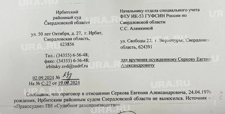 К своему письму он приложил ответ из Ирбитского суда на свой запрос. «Сообщаем, что приговор в отношении Серкова Евгения Александровича, 24.04.1976 года рождения, Ирбитским районным судом Свердловской области не выносился», — сказано в документе.