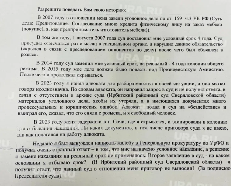 В 2023 году его задержали в Сочи и этапировали в колонию Верхотурья. «Никаких документов, в том числе приговора суда, я не имею, так как полагался на адвоката. Недавно я был вынужден написать жалобу в Генеральную прокуратуру по УрФО и получил очень странный ответ: мне назначено условное наказание, а решение о замене наказания на реальный срок не применялось. Второе заявление в суд: на каком основании я отбываю срок? Я получил ответ, что данный суд в отношении меня приговор не выносил!» — утверждает Евгений.