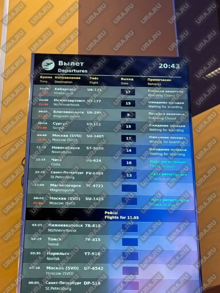 «Уральские авиалинии», летевшие из Санкт-Петербурга в Хабаровск с остановкой в Екатеринбурге, задерживают рейс до 21:00. Вылет был запланирован на 19.05. Рейс из Москвы в Благовещенск с пересадкой в Екатеринбурге задержан с 20:25 до 21:00.