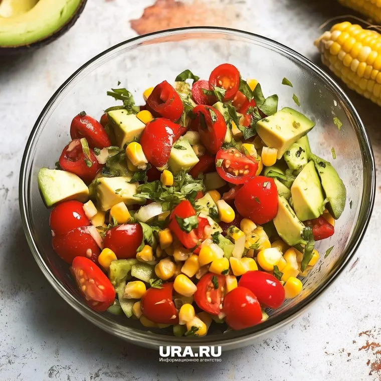 Этот салат — напоминание о лете даже в холодное время года. Авокадо придает салату кремовую текстуру, помидоры — сочность, а кукуруза — сладость. Очень простой и освежающий салат.