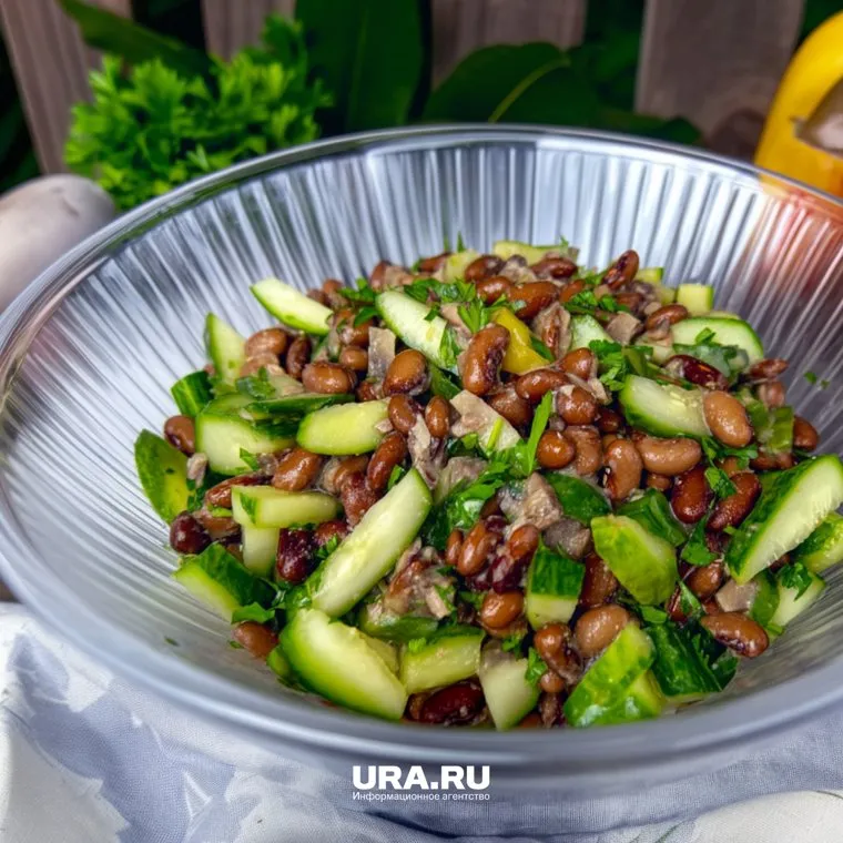 Этот салат — отличный вариант для тех, кто хочет сытно пообедать или поужинать в пост. Фасоль богата растительным белком, а грибы и маринованные огурцы придают салату пикантность и насыщенный вкус.