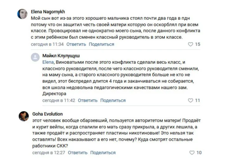 На это в соцсетях указывают и другие родители. «Мой сын вот из-за этого хорошего мальчика стоял почти два года в ПДН, потому что он защитил честь своей матери, которую он [Александр] оскорблял при всем классе. Провоцировал неоднократно моего сына, после данного конфликта с этим ребенком был сменен классный руководитель в этом классе», — написала Елена Нагорных в комментариях группы «ВКонтакте» «Подслушано Сысерть №1».