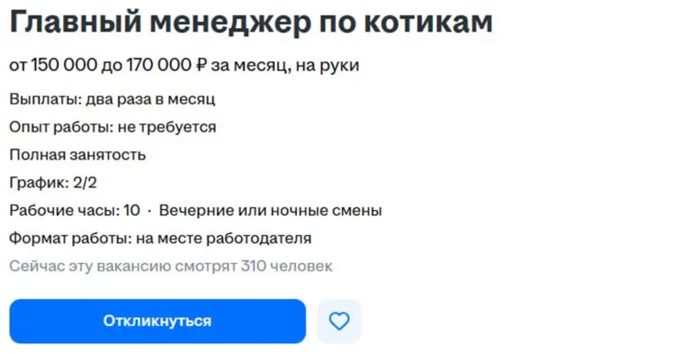 Работнику обещают платить от 150 до 170 тысяч рублей в месяц. Опыт работы не требуют, а график — 2/2. Кроме того, заработную плату, якобы, повысят за рождение ребенка, так как «коты ценят, когда их подданные расширяют свою стаю».