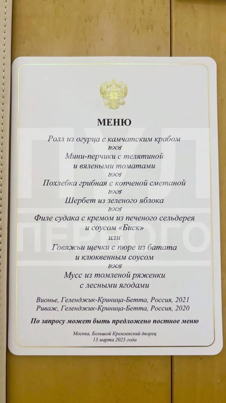 Стало известно, что подавали на обед лидерам двух стран и делегатам. В меню были роллы из огурца с камчатским крабом, мини-перчики с телятиной и вяленными томатами, похлебка грибная с копченой сметаной, щербет из зеленого яблока, филе судака с кремом из печеного сельдерея и соусом «Биск», Говяжьи щечки с пюре из батата и клюквенным соусом и муз из томленой ряженки с лесными ягодами.