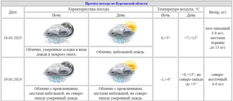 «Температура днем 19 марта: +8,+13 градусов. Ночью: -1,+4. Небольшой дождь», — сообщается на сайте Курганского ЦГМС.