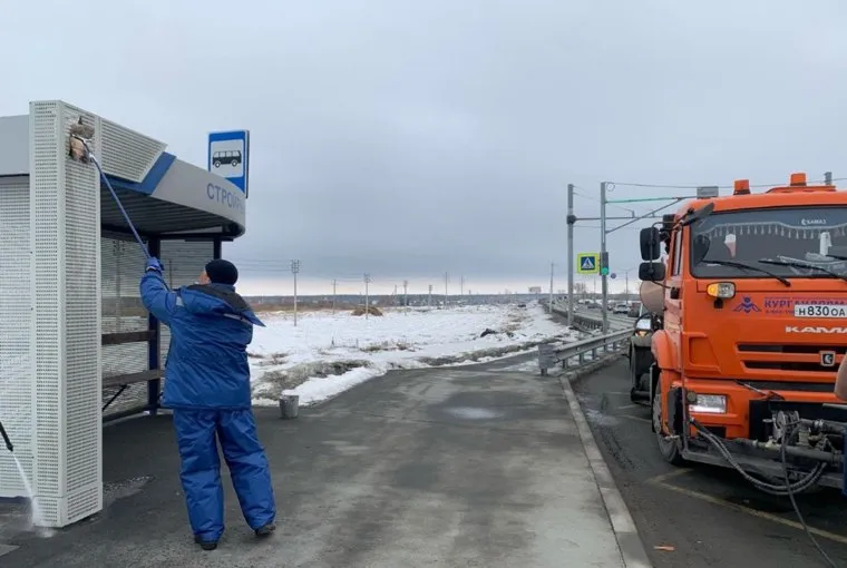 После продолжительной зимы в Кургане начали проводить работы по отмывке остановочных комплексов. Об этом сообщает администрация города.