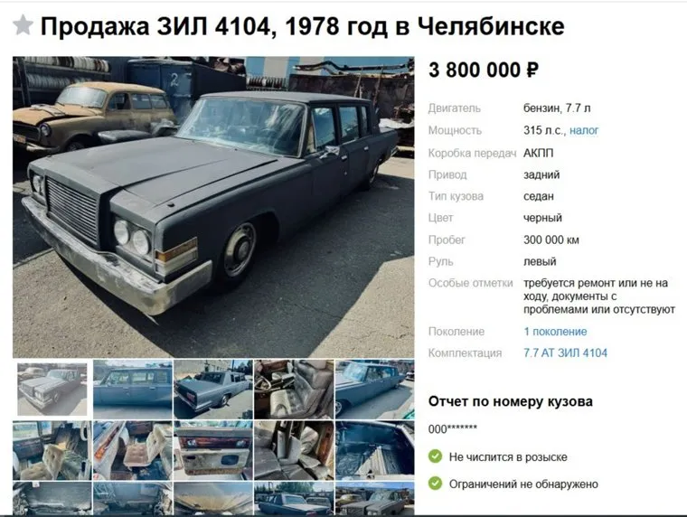 «ЗИЛ-4104 (115) под реставрацию, передний бампер новодел, документы советские. Машина по низу рынка, не ждите от нее чуда», — говорится в предложении на онлайн-площадке.