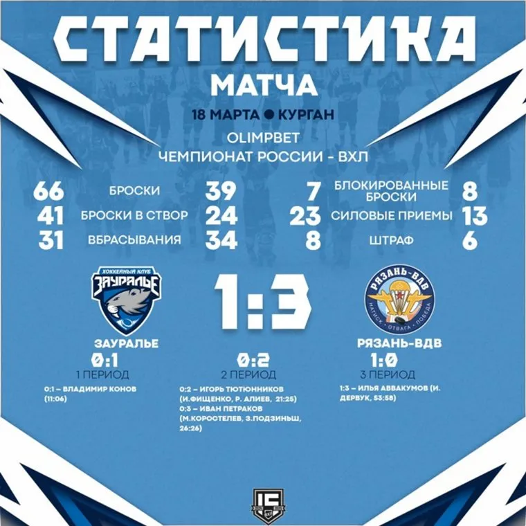 «ХК „Зауралье очень хорошо начал, но затем хоккеисты потеряли нити игры и соперник „Рязань-ВДВ“ этим воспользовался. Курганцы приложили максимум усилий, чтобы отыграться, но не смогли“, — сообщается в telegram-канале ХК „Зауралье“. Счет игры 1:3 в пользу соперника.