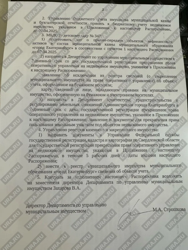 «Изъять недвижимое имущество, закрепленное на праве оперативного управления за МБДОУ — детским садом №347 в состав муниципальной казны», — говорится в документе, который есть в распоряжении URA.RU. Управлению бюджетного учета нужно принять имущество до 7 апреля.