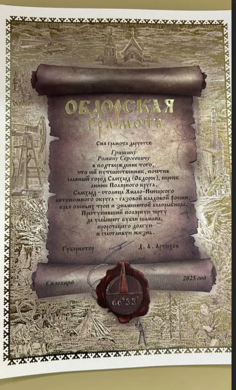 «Сия грамота даруется в подтверждение того, что сей путешественник, посетив славный город Салехард (Обдорск), пересек линию Полярного круга. Салехард — столица Ямало-Ненецкого автономного округа — газовой кладовой России, края оленьих троп, и знаменитой белорыбицы. Преступивший полярную черту да услышит бубен шамана, пророчащего долгую и счастливую жизнь», — написано на Обдорской грамоте.