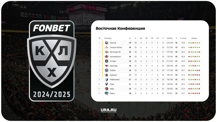 Восточная конференция традиционно демонстрирует высокую конкурентность. «Трактор» лидирует с 96 очками, «Салават Юлаев» идет вторым с 91 очком, а «Металлург» замыкает тройку лидеров с 90 очками.