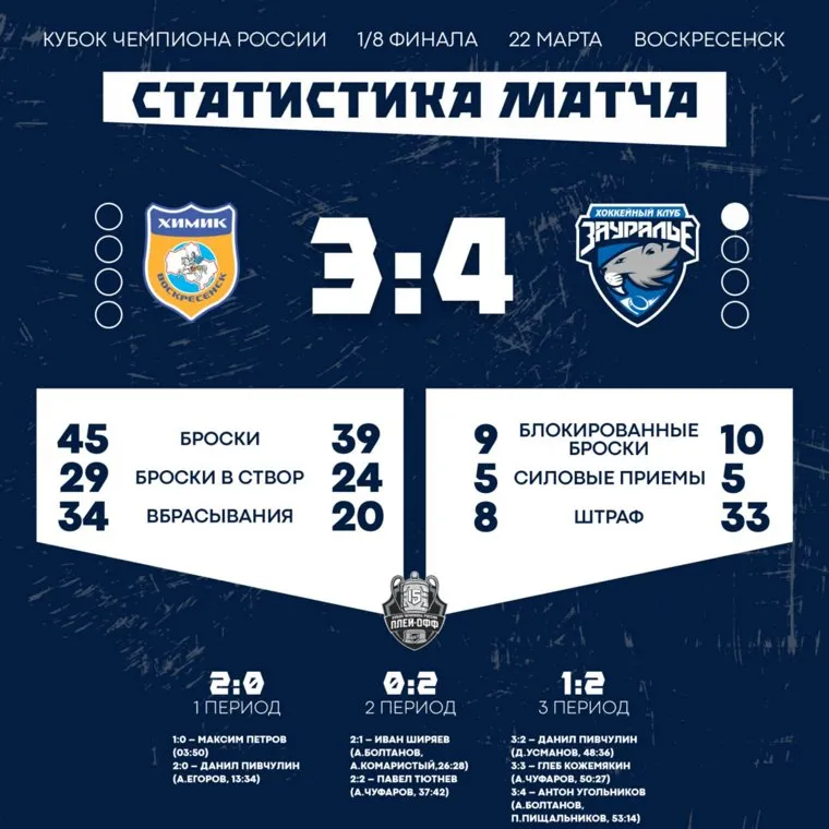 «Забираем победу — 3:4. Мощнейший курганский характер мы продемонстрировали — забираем первый матч и ведем в серии 1-0», — говорится в telegram-канале клуба. 24 марта на воскресенском льду состоится второй матч между этими командами.