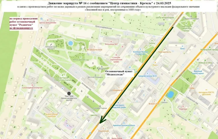 «Уважаемые тоболяки и гости города! С 24 марта 2025 года в связи с работами по валке деревьев в районе Земляного вала (объекта культурного наследия) временно меняется схема движения автобусного маршрута №16 „Центр гимнастики — Кремль“, — рассказали в telegram-канале администрации.