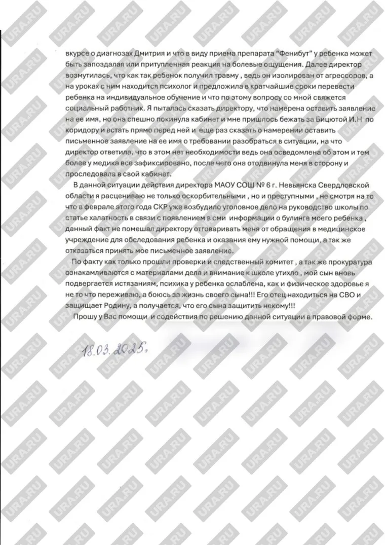 Ей предложили перевести Диму на индивидуальное обучение и сказали, что с ней свяжется социальный работник. Полина написала на имя директора письменное заявление с требованием разобраться в ситуации, однако директор якобы ответила, что в этом нет необходимости — она осведомлена, а у медика все зафиксировано. «После чего она отодвинула меня в сторону и проследовала в свой кабинет. В данной ситуации действия директора МАОУ СОШ №6 я расцениваю не только оскорбительными, но и преступными», — добавила Полина.