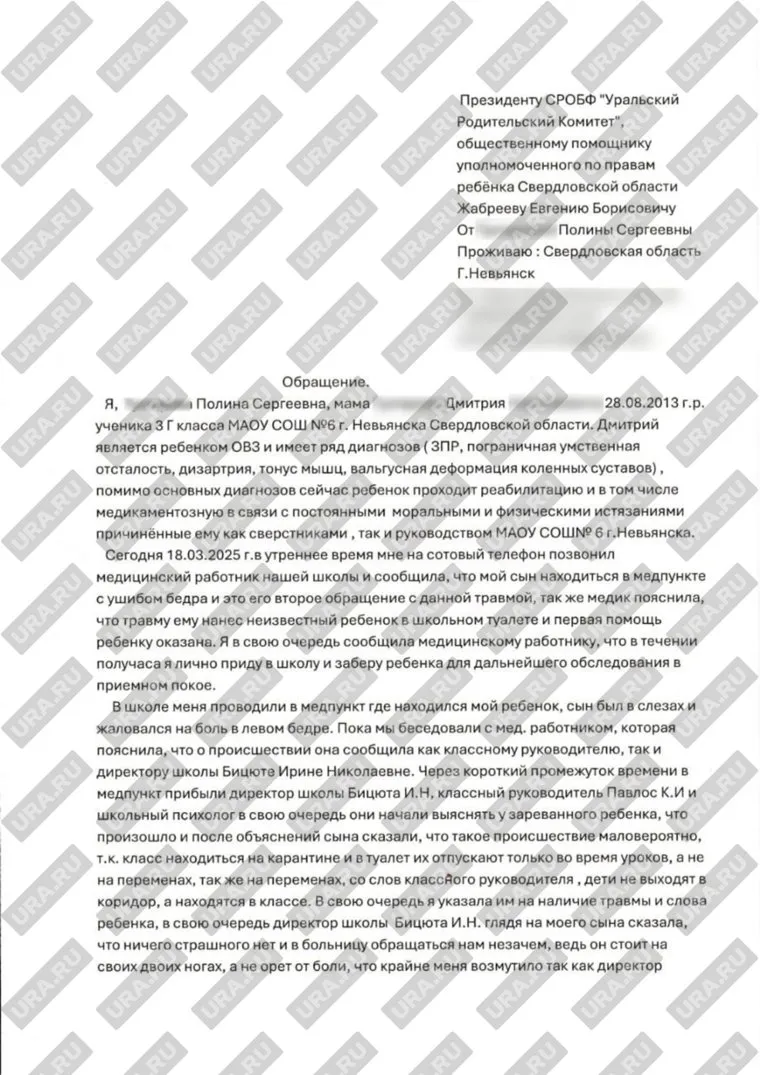 Мама 11-летнего Димы — мальчика с особенностями развития, избитого в невьянской школе №6 (Свердловская область), — заявила, что руководство школы якобы пыталось отговорить ее от обращения в больницу. Когда она пришла забирать сына, ей сказали, что «происшествие маловероятно», сообщила URA.RU женщина.
