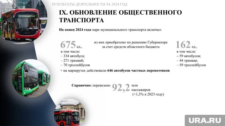 Глава Челябинска подчеркнул, что за минувший год городской транспортный парк был обновлен на 162 единицы. По городским улицам начали курсировать 59 новых автобусов, 44 трамвая и 59 троллейбусов.