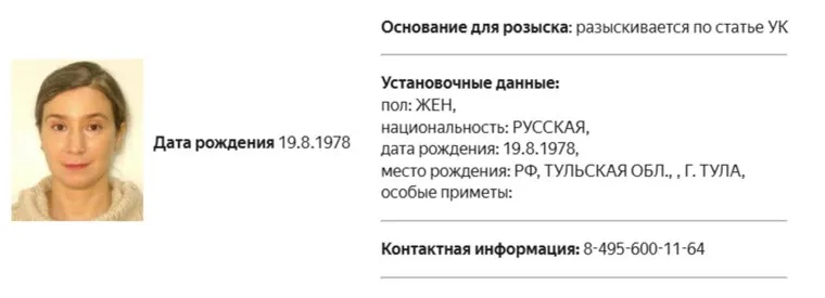 «Разыскивается по статье УК РФ», — указано в карточке Шульман. Конкретная статья, по которой ведется розыск, не уточняется.