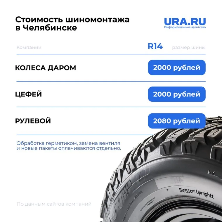 «В компании „Колеса даром“ расчет идет за одно колесо. Сезонный шиномонтаж R14 с мойкой обойдется в 2000 рублей за легковой автомобиль, 3640 за легкогрузовой и 2400 за внедорожник», — передает корреспондент URA.RU со ссылкой на официальный сайт компании.
