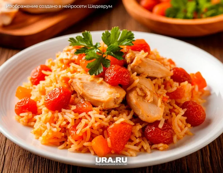 Ингредиенты: 300 г риса (длиннозерный), 400 г куриного филе, 100 г кураги, 1 луковица, 1 морковь, 2 ст. л. растительного масла, 1 ч. л. зиры, 1 ч. л. куркумы, 500 мл воды, соль, перец, горсть изюма (по желанию).