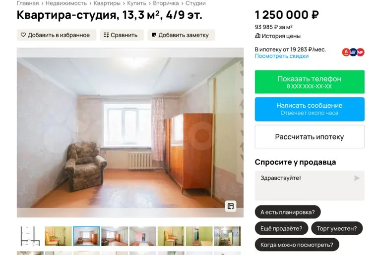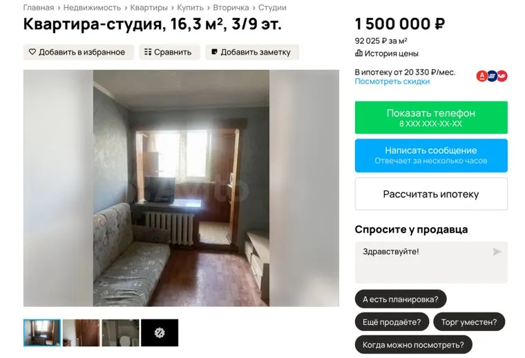 «Квартира-студия, 12,3 квадратных метра. Предлагаем уютную комнату в общежитии. Цена — 1 150 000 рублей»,— говорится в объявлении. Это самый дешевый вариант в Тюмени, выставленный на продажу.