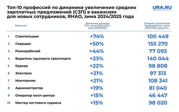 «В топ-10 профессий по динамике увеличения СЗП в вакансиях для новых сотрудников в основном вошли рабочие специальности. Возглавили список стропальщики с ростом зарплатных предложений +75% по сравнению с зимним периодом прошлого года», — отметили аналитики. Их средняя зарплата в ЯНАО составляла 100 449 рублей.