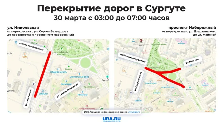 «Будет перекрыто движение автотранспорта: улицы Никольской от перекрестка с улицей Сергея Безверхова до перекрестка с проспектом Набережный. Проспект Набережный [перекроют] от перекрестка с улицей Дзержинского до улицы Майской», — следует из сообщения. Движения автотранспорта ограничат с 3:00 до 7:00 утра.