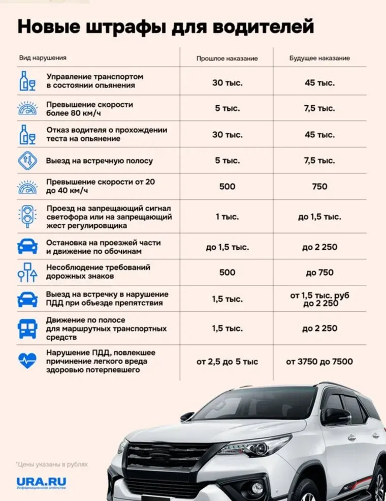 Пьяное вождение: В соответствии с новыми правками, за управление транспортом в состоянии опьянения предусмотрен штраф до 45 тысяч рублей. Такой же штраф налагается на водителя, который отказывается проходить медицинское освидетельствование на состояние опьянения.