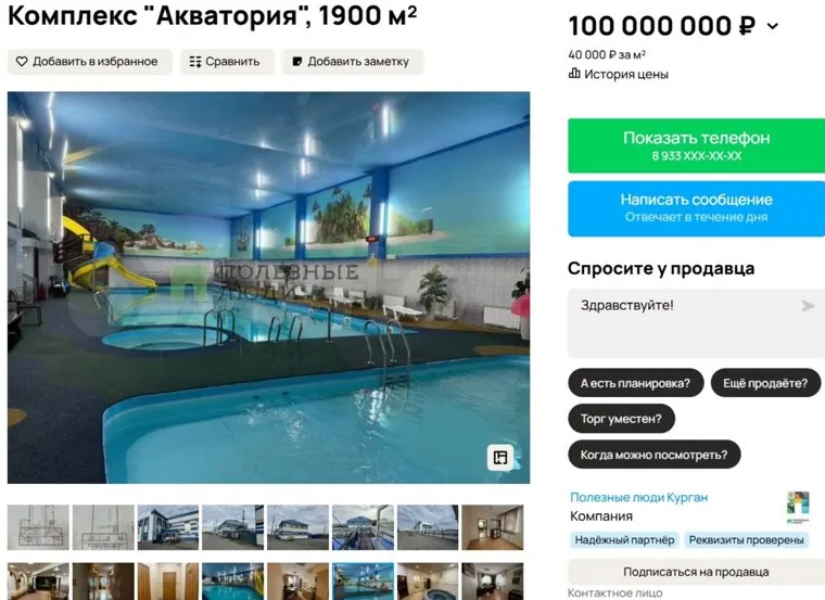 В Кургане единственный в городе аквапарк выставлен на продажу. Здание аквакомплекса в Восточном предлагается приобрести за 100 000 000 рублей. Объявление размещено на сайте «Авито».