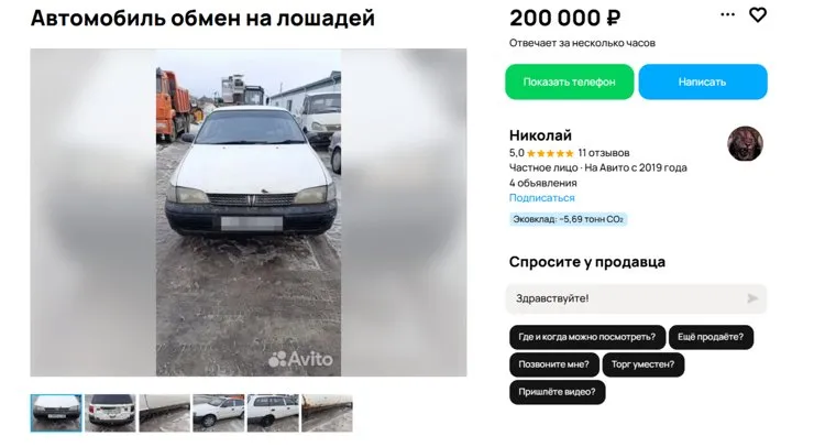 «Обменяю авто на двух лошадей предлагайте пишите обговорим. Цена авто 200 тысяч», — говорится в объявлении на сайте «Авито». Предложение уже вызвало ажиотаж — за сутки его просмотрели более 100 раз.